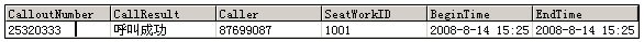 當(dāng)座席E1呼入時, 接收主叫號碼(87699078), 同時發(fā)出呼叫(主叫號碼為87699078,被叫為25320333),并通過預(yù)測撥號識別各類呼叫結(jié)果,如:忙音、空號、或無人接聽等,只將有效的通話轉(zhuǎn)接至業(yè)務(wù)人員,同時將呼叫結(jié)果寫入數(shù)據(jù)庫UT_IMCALL表(如下圖), 備下次呼叫參考, 同時記錄了工號及呼出主叫, 當(dāng)該客戶(25320333)呼入時,呼叫87699078號碼即可。