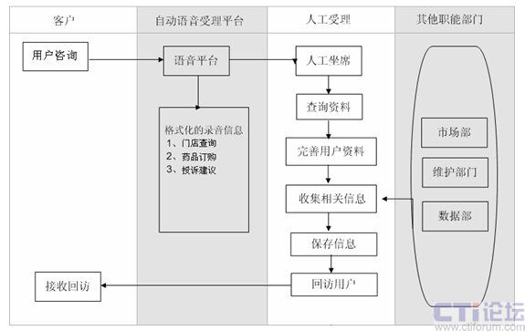 用戶選擇電話訂購后,轉(zhuǎn)接到電話訂購服務(wù)組,由坐席人員根據(jù)用戶說明的藥品名稱查詢,告知用戶價格,記錄用戶信息,詢問是否需要送貨,是否需要發(fā)票等信息。