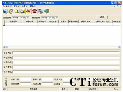 指揮中心信息查詢系統(tǒng)基于客戶/服務器方式。支持全中文檢索及模糊查詢、組合條件查詢、記錄瀏覽查詢、綜合查詢、提供指揮中心與信息中心間數(shù)據(jù)的雙向數(shù)據(jù)流動等功能。還可對120相關信息進行錄入、分類、保存、歸檔、管理維護,并提供檢索及查詢、綜合匯總、報表生成、統(tǒng)計打印及發(fā)送給領導審閱等功能,并可跟蹤值機人員對120報警的受理急救、指揮的每一步驟的處理情況。