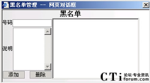 當(dāng)重復(fù)有騷撓電話打入時,可以點(diǎn)擊“黑名單管理”按鈕,將電話號碼輸入左側(cè)的“號碼”輸入欄,點(diǎn)擊“添加”按鈕,添加到黑名單,以后該電話再次打入,將聽到警告語音,并將不能打入座席,可以點(diǎn)“刪除”按鈕將選中的黑名單內(nèi)的電話刪除,該電話就可以正常打入。