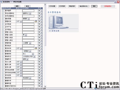 可以點(diǎn)擊進(jìn)入“復(fù)雜查詢”界面,進(jìn)行全部警情的全條件查詢,在要查詢的條件前打勾,輸入或選擇相應(yīng)的條件,再在后面的“關(guān)系”中選擇不同的條件之間的邏輯關(guān)系,點(diǎn)擊“查詢”按鈕,即可對全部警情進(jìn)行查詢。