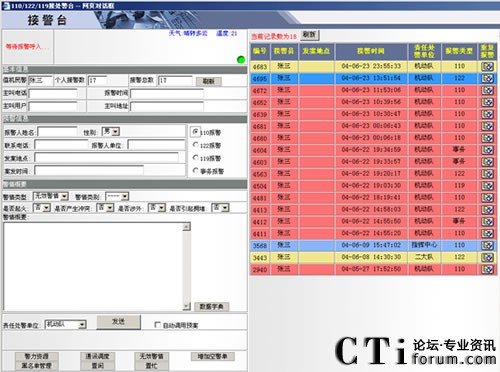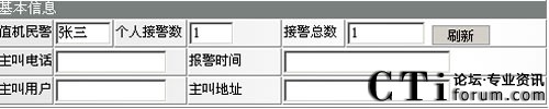 當(dāng)接警員登錄后,值機(jī)民警欄顯示該接警員信息,個人接警數(shù)欄顯示該接警員的接警數(shù),接警總數(shù)欄顯示接警的總數(shù);當(dāng)有一條警進(jìn)入后,主叫電話、主叫用戶、主叫地址、接警時間欄內(nèi)的信息自動生成。