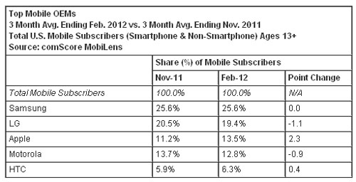 按截至今年2月份的三個(gè)月的平均數(shù)計(jì)算,美國13歲以上的手機(jī)用戶數(shù)為2.34億。三星名列手機(jī)原始設(shè)備制造商之首,占有美國手機(jī)市場25.6%的份額;LG電子名列第二,占有19.4%的市場份額;蘋果排名第三,占有13.5%的市場份額(上升2.3個(gè)百分點(diǎn));摩托羅拉排名第四,占有12.8的市場份額;HTC排名上升至第五,占有6.3%的市場份額(上升0.4個(gè)百分點(diǎn))。