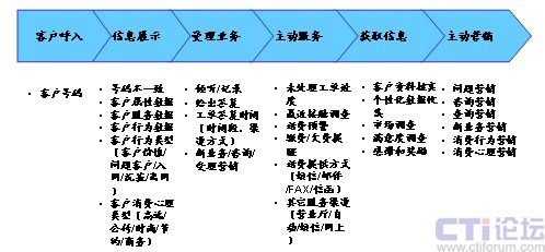 在上面的流程中,將一次客戶接觸,轉(zhuǎn)變?yōu)橐淮稳娴目蛻艋?dòng)機(jī)會(huì),通過對(duì)客戶信息360度的洞察和客戶的互動(dòng)溝通,在為客戶提供基本服務(wù)的同時(shí),根據(jù)客戶的基本資料、歷史消費(fèi)數(shù)據(jù)等,挖掘客戶的隱性需求,從而有選擇的開展客戶關(guān)懷、客戶信息收集、客戶維系、主動(dòng)營銷活動(dòng)。下面以一個(gè)電信運(yùn)營商的客戶呼入流程為例,說明在一個(gè)以客戶為中心的客戶接觸流程中,坐席代表可以開展的客戶接觸活動(dòng)(圖4)。
