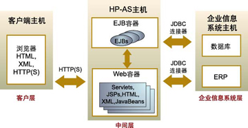 在一個(gè)開(kāi)發(fā)環(huán)境中把上述3層一般都安裝在同一臺(tái)計(jì)算機(jī)上,以便模擬3層環(huán)境。這樣,開(kāi)發(fā)者在實(shí)際環(huán)境開(kāi)發(fā)應(yīng)用之前,可以快速開(kāi)發(fā)和測(cè)試應(yīng)用?墒牵趯(shí)際環(huán)境中,各個(gè)層一般位于不同的計(jì)算機(jī)上。圖2表示了HP-AS是如何采用J2EE技術(shù)實(shí)現(xiàn)分布式應(yīng)用的。