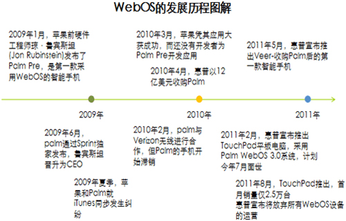 從WebOS的發(fā)展歷程看,惠普收購Palm后,1年之后才推出一款新的智能手機,今年8月才推出了首款平板電腦TouchPad.而TouchPad的月銷量不佳成為導火索,惠普最終決定放棄所有WebOS設(shè)備的運營。