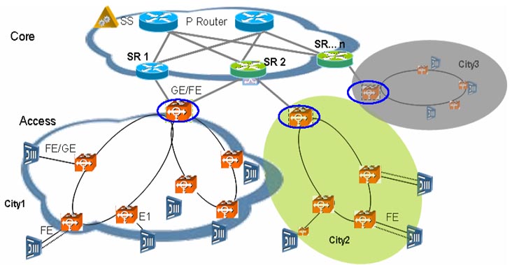 綜合接入主要關(guān)注語音和少量寬帶業(yè)務和專線,上行接口一般是E1和FE/GE。傳統(tǒng)窄帶語音業(yè)務、TDM專線等或MSAN使用于窄帶交換機組網(wǎng)的時候采用E1上行方式,其它時候采用FE/GE上行。接入層面采用的承載網(wǎng)設(shè)備必須同時能夠支持E1和FE/GE接入,因此承載網(wǎng)設(shè)備必須具備多業(yè)務傳輸特性,傳統(tǒng)SDH設(shè)備,傳統(tǒng)LANSwitch設(shè)備無法滿足組網(wǎng)需求。
