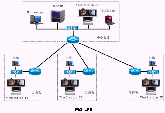 根據(jù)需求及網(wǎng)絡(luò)情況,我們?yōu)樘窖蟊kU建設(shè)基于系統(tǒng)內(nèi)部Intranet的基于H.323標(biāo)準(zhǔn)的視頻會議系統(tǒng)。系統(tǒng)以1個MCU(多點控制單元)為中心,包括1個主會場,13個分會場,10個個人桌面系統(tǒng)。