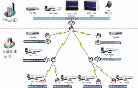 華電集團(tuán)領(lǐng)導(dǎo)十分重視電力信息化及華電集團(tuán)電子政務(wù)的建設(shè)工作。為了貫徹國(guó)務(wù)院對(duì)政府系統(tǒng)信息化建設(shè)的要求,實(shí)現(xiàn)華電集團(tuán)政務(wù)辦公和行業(yè)管理信息服務(wù)的電子化、網(wǎng)絡(luò)化,滿足華電集團(tuán)建立辦事高效、運(yùn)轉(zhuǎn)協(xié)調(diào)、行為規(guī)范的行政管理體制的要求,加快推進(jìn)電力行業(yè)信息化建設(shè),華電集團(tuán)決定開展華電集團(tuán)信息化建設(shè)二期工程建設(shè),即在現(xiàn)有的基礎(chǔ)上再增加一臺(tái)MCU以及在下屬企業(yè)及電廠增加37臺(tái)終端。鑒于POLYCOM在視頻會(huì)議強(qiáng)大的技術(shù)優(yōu)勢(shì)以及神州數(shù)碼在視頻會(huì)議系統(tǒng)建設(shè)和實(shí)施上的雄厚實(shí)力和豐富經(jīng)驗(yàn),華電集團(tuán)決定包括MCU和終端的所有設(shè)備都采用POLYCOM的產(chǎn)品。整個(gè)系統(tǒng)主要建立在華電集團(tuán)現(xiàn)有的視頻會(huì)議的基礎(chǔ)之上,依據(jù)H.323標(biāo)準(zhǔn)協(xié)議建設(shè)視頻會(huì)議系統(tǒng)二期組網(wǎng)。其中,控制中心新增一臺(tái)POLYCOM公司的MGC+100多點(diǎn)控制單元(即MCU);POLYCOM 高性能的VSX7000E作為下屬企業(yè)及電廠主接點(diǎn)視頻會(huì)議終端。