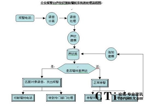 公安報警臺聲紋識別防騷擾系統(tǒng)的處理流程為: