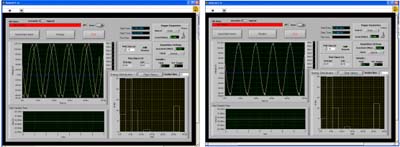當(dāng)兩個(gè)(或多個(gè))設(shè)備一起工作并對時(shí)間有精確要求的時(shí)候,就需要在它們之間進(jìn)行同步。同步是基于在兩個(gè)設(shè)備之間規(guī)定一個(gè)共同的時(shí)間參考,試想如果將不同音軌的音頻訊號分別錄在不同的磁帶機(jī)上,則必須將這兩個(gè)磁帶機(jī)的磁帶傳送軸鎖定在一起,否則將來撥放出來就會(huì)有相位上的誤差,這個(gè)過程就稱為同步。假使這兩個(gè)設(shè)備沒有進(jìn)行同步,無論它們開始的時(shí)間多么一致,也會(huì)由于兩臺設(shè)備在機(jī)械結(jié)構(gòu)的差異而產(chǎn)生時(shí)間漂移。同樣的,對于數(shù)據(jù)采集卡也是一樣的概念,甚至在要求上更為嚴(yán)格。而如何達(dá)到數(shù)據(jù)同步采集,最基本的要求就是不同模塊間要有相同的工作時(shí)脈與一致的觸發(fā)信號,而這個(gè)相同的時(shí)脈信號需來自于共同的外部儀器。下圖中的弦波是兩張數(shù)據(jù)采集卡在同步與異步采集同一信號源所得的波形,在左圖中因異步而存在一向位差,右圖中則是同步觸發(fā)下得到完全重迭的波形。