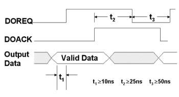 在上圖中,當(dāng)有效數(shù)據(jù)在緩沖存儲(chǔ)器中等待被輸出時(shí),此時(shí)板卡上DOREQ的信號準(zhǔn)位會(huì)被拉高,以通知接收端輸出數(shù)據(jù)已經(jīng)被送出,當(dāng)接收端收到數(shù)據(jù)時(shí),則會(huì)產(chǎn)生DOACK的信號通知發(fā)送端數(shù)據(jù)已完成接收,發(fā)送端收到此一信號后,即將DOREQ準(zhǔn)位拉低,并等待下一筆要輸出的數(shù)據(jù),而不斷重復(fù)上述步驟,直到將所有數(shù)據(jù)輸出完成。所以當(dāng)兩個(gè)支持交握信號的模塊在數(shù)據(jù)傳輸時(shí),其正確的接線方式為將輸出端的ACK訊號線與輸入端的REQ訊號線相聯(lián)接,輸出端的REQ訊號線與輸入端的ACK訊號線相聯(lián)接。凌華科技的PCI-7300A高速數(shù)字I/O卡,支持外部時(shí)脈及完整的信號交握傳輸,其最高傳輸速度達(dá)80MB/sec,數(shù)據(jù)長度可依使用者的需求設(shè)定為8、16、及32