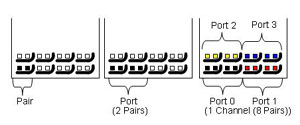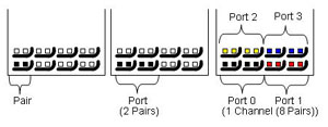 ATCA Fabric 接口信道是建立在LVDS(低壓差分信號, Low Voltage Differential Signaling )差分對 ( differential pairs) 基礎(chǔ)之上,電氣特性需求是建立在3.125GHz SERDES 信號基礎(chǔ)之上。數(shù)據(jù)編碼使用8b/10b 編碼機制 , 并指定交流電信號對接以防止直流電邏輯層面上的數(shù)據(jù)傳輸?shù)母蓴_。ATCA中兩個板子的最小連接單元稱作通路(channel),一個通路(channel) 由4個埠 (port) 組成,每個埠(port) 又由兩對差分信號(differential pair) 組成,構(gòu)成了ATCA Fabric 接口的最小連接單元。端口的兩對差分信號被映像成一收一發(fā)的傳輸模式。下圖描繪了一個差分對、一個埠、以及一個通路的針腳分布: