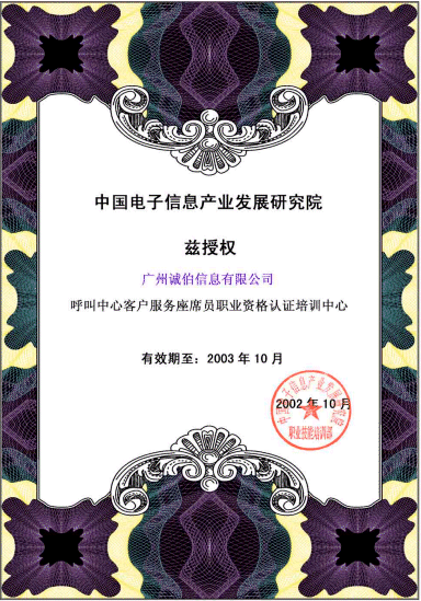 近日,廣州誠伯信息有限公司正式成為信息產(chǎn)業(yè)部電子行業(yè)技能鑒定指導中心授權的"呼叫中心職業(yè)標準體系"培訓單位。