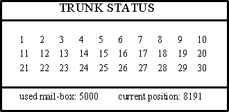 如上圖所示,系統(tǒng)狀態(tài)顯示窗口顯示了中繼狀態(tài)和語音信箱使用狀態(tài)。中繼狀態(tài)每行顯示10條中繼,當只有一個PCM時,有30條中繼,顯示3行,當PCM增加時,行數自動增加。