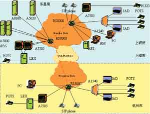 杭州秋濤局配置的是A7505中繼網(wǎng)關(guān)、A1540接入網(wǎng)關(guān)以及其他的綜合接入設備、SIP終端、H.323終端等。A7505同當?shù)亟粨Q機配合可以經(jīng)由IP骨干網(wǎng)實現(xiàn)上海到杭州的長途語音業(yè)務。A1540及經(jīng)由它的ST700可以實現(xiàn)NGN的語音數(shù)據(jù)業(yè)務。杭州到上海的連接是通過中國電信的IP骨干網(wǎng)實現(xiàn)的。