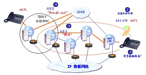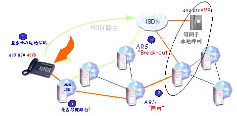 如果,一個(gè)網(wǎng)絡(luò)用戶想與一個(gè)外線用戶通話。ARS應(yīng)用程序分析所撥號碼。根據(jù)不同的呼叫方向,選擇最廉費(fèi)用的運(yùn)營商,而不管網(wǎng)絡(luò)內(nèi)的物理連接。地址信息將會被修改,從而符合該運(yùn)營商的編號計(jì)劃(增加,刪除或轉(zhuǎn)換數(shù)字),并且被叫號碼和轉(zhuǎn)換后的號碼將會被存貯在呼叫詳細(xì)記錄(CDR)內(nèi)。