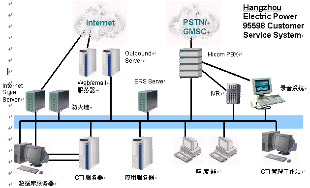西門子Hicom 350E,作為杭州電力"95598"客服系統(tǒng)的通信服務(wù)器,以其出色的品質(zhì)和強(qiáng)大的功能保證了整個(gè)系統(tǒng)的正常運(yùn)行。同時(shí)充分利用杭州電力局原有的通訊線路,創(chuàng)新性的在原有的SDH(同步數(shù)字體系)網(wǎng)絡(luò)上利用HiPath HG 3200遠(yuǎn)端模塊,將中心的人工坐席延伸到了五個(gè)郊縣電力公司,真正解決了全市統(tǒng)一接入,一個(gè)號(hào)碼對(duì)外,業(yè)務(wù)本地受理的問(wèn)題;同時(shí)遠(yuǎn)端坐席的工作方式真正做到和中心完全一致,給使用、管理、培訓(xùn)等帶來(lái)極大的便利。