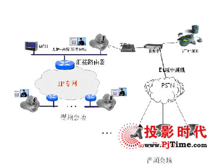 以上拓?fù)鋱D為某單位建立的一套視頻會(huì)議系統(tǒng),會(huì)場地理?xiàng)l件比較惡劣,計(jì)劃組建一套交互式電話會(huì)議系統(tǒng)進(jìn)行擴(kuò)展,并且音頻及視頻會(huì)議可以充份融合的方案。主會(huì)場配備一套POLYCOM