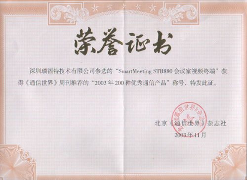 瑞福特視頻會(huì)議產(chǎn)品榮獲"2003年200種優(yōu)秀通信產(chǎn)品"稱(chēng)號(hào)