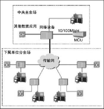 各節(jié)點的接入采用一條512Kbps帶寬的DDN/E1線路接入本地電信公司;在總部采用集中式接入中央電信公司,接入中心的電路帶寬應(yīng)該是多條信道捆綁的帶寬,中心節(jié)點交換機(jī)采用10/100Mbps與MCU相連,總部主會場的視頻終端通過接入交換機(jī)與MCU進(jìn)行通信。