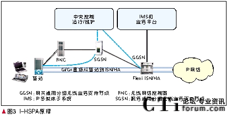 Mb/s為例,一個1 500個扇區(qū)的HSDPA網(wǎng)絡(luò)所產(chǎn)生的數(shù)據(jù)量為21.6 Gb/s。目前業(yè)界RNC的數(shù)據(jù)吞吐量僅達到1 Gb/s。今天各運營商建設(shè)的3G網(wǎng)絡(luò)與2G共用核心網(wǎng),其帶寬和數(shù)據(jù)處理能力遠(yuǎn)遠(yuǎn)不能滿足HSPA高數(shù)據(jù)率的需求。當(dāng)數(shù)據(jù)負(fù)荷激增時運營商將面對RNC/SGSN的擴容的巨大壓力。此外在每一個節(jié)點處對數(shù)據(jù)包的重新拆裝會導(dǎo)致在每一節(jié)點都要引入額外的時延。結(jié)果會產(chǎn)生較長的網(wǎng)絡(luò)時延。對于移動互聯(lián)網(wǎng)應(yīng)用,這種多層次的網(wǎng)絡(luò)結(jié)構(gòu)是沒有必要的。使網(wǎng)絡(luò)扁平化不僅可以簡化設(shè)備降低成本,還可以減少時延。I-HSPA應(yīng)運而生。這種架構(gòu)把基站通過Gi/Gn口直接連接到GGSN節(jié)點(通向互聯(lián)網(wǎng)和數(shù)據(jù)業(yè)務(wù)的網(wǎng)關(guān))[5]。I-HSPA原理如圖3所示。