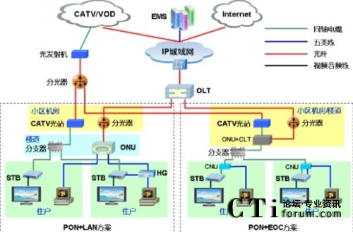 而xPON+LAN解決方案適合于新建小區(qū)或五類線可入戶小區(qū),該方案原有HFC網(wǎng)絡(luò)保持不變,五類線直接進(jìn)家庭,工作量少,施工難度小,建設(shè)速度快,投資較少。能夠?yàn)橛脩籼峁⿲拵Ы尤敕⻊?wù),并提供數(shù)字電視回傳通道,使廣電能夠?qū)崿F(xiàn)交互電視、視頻點(diǎn)播等多種業(yè)務(wù)。