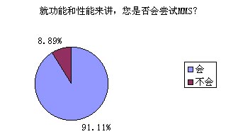 題8的調查結果對于中國移動來講絕對是充滿誘惑的,高達91.11%的被訪者表示他們非常愿意嘗試MMS的功能和服務,無疑這對ICP們(MMS服務的重要載體)也是一針強心劑!