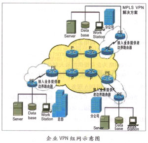 下圖是提供VPN業(yè)務(wù)的例子。其中業(yè)務(wù)提供者邊界路由器(PE)相當于MPLS區(qū)域邊界路由器(LER),它了解整個MPLS VPN的網(wǎng)絡(luò)拓撲結(jié)構(gòu)。用戶邊界路由器(CE)可以只是一個
