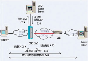 在網(wǎng)通有限公司為中建總公司建設(shè)的網(wǎng)絡(luò)中,當(dāng)用戶撥上網(wǎng)絡(luò)時(shí),網(wǎng)通有限公司的認(rèn)證系統(tǒng)會(huì)根據(jù)帶域名的用戶名確定是哪個(gè)地區(qū)的VPDN用戶,并通過(guò)一系列步驟實(shí)現(xiàn)用戶與企業(yè)之間的內(nèi)部通信。