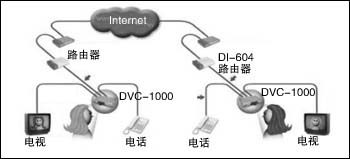 Modem上。圖1通過(guò)DI-604路由器與DSL Modem連接,實(shí)現(xiàn)與Internet互聯(lián)。DVC-1000還配備了一個(gè)電話機(jī)接口,可以外接一部普通電話機(jī)作為話音交流和撥號(hào)設(shè)備。