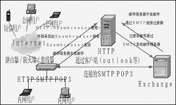 在這里,Spambreaker相當(dāng)于郵件過濾網(wǎng)關(guān),外部進(jìn)入信件首先由Spambreaker接收,進(jìn)行過濾后再發(fā)送給真正的后臺郵件服務(wù)器Exchange;外發(fā)信件時,通過設(shè)置將Spambreaker設(shè)置為Exchange的MailHUB,這樣,Exchange的外發(fā)信件就會首先發(fā)送給Spambreaker,經(jīng)過過濾后由Spambreaker發(fā)送到Internet上。