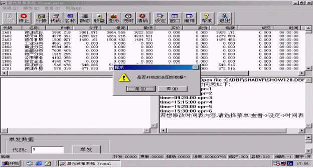 選擇該功能,系統(tǒng)會自動發(fā)送所有指數(shù)和股票的歷史圖形。歷史圖形發(fā)送用時較長,一般要用一個小時左右,它中間的延時要由信息發(fā)布時間間隔來定,信息發(fā)布時間間隔越大,耗時越長。