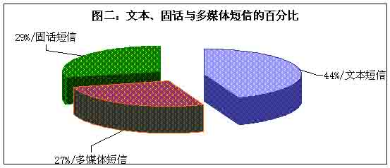 目前市場的主流短信主要有三大類,即傳統(tǒng)的手機(jī)文本短信、流行的圖音文字兼?zhèn)涞摹安市拧焙托峦瞥龅墓淘挾绦。整個(gè)短信市場確實(shí)火了,但是在火爆的背后哪一種短信是真正的巨無霸?調(diào)查表明,在三類短信之中,選擇文本類短信的用戶最多,占據(jù)44%,其次是固話短信,再次是多媒體短信,即俗稱的“彩信”,選擇固話短信和彩信的百分比十分接近。(見圖二)看來,“巨無霸”非文本類短信莫屬。
