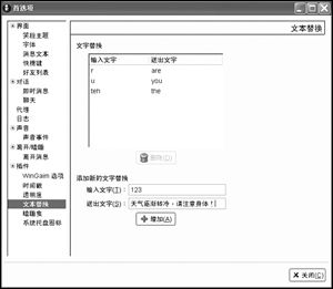 文本替換:根據(jù)用戶自定義的規(guī)則替換發(fā)出的消息,其實(shí)差不多類似于縮寫功能,你可以把一段話定義成一個字母,以后只要輸入這個字母,就會直接顯示這段話了。比如在缺省設(shè)置下,輸入“r”即可送出“are”,輸入“u”即可送出“you”(如圖7)。