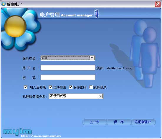 先添加相應(yīng)的賬戶;點(diǎn)擊"添加新賬戶"按鈕,彈出"賬戶管理"頁(yè)面,在"服務(wù)類型"的下拉列表中選擇相應(yīng)的服務(wù)類型,再依次輸入用戶名和密碼;設(shè)定完成后點(diǎn)擊"保存"即完成新賬戶的添加;保存完畢后myim自動(dòng)返回登錄界面。