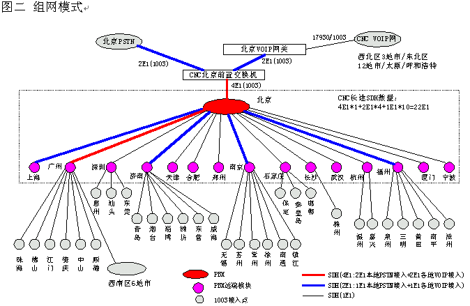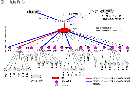 網(wǎng)通的客戶服務系統(tǒng)(1003呼叫中心)包括位于北京總部的總中心及其它全國30多個城市的分中心,全國范圍共有近200個接入點(覆蓋城市),共有200余座席,由總中心,交換機遠端模塊接入點子中心及軟覆蓋接入點組成的三層架構(gòu)。參見下圖一《系統(tǒng)架構(gòu)》及圖二《組網(wǎng)模式》。