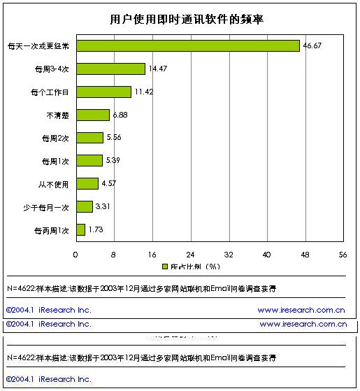 即時通訊所擁有的實時性、跨平臺性、成本低、效率高等諸多優(yōu)勢,使之成為網(wǎng)民們最喜愛的網(wǎng)絡溝通方式之一。從用戶使用即時通訊軟件的頻率來看,是比較高的。根據(jù)我們的調(diào)研結(jié)果,58%的用戶至少每天使用一次即時通訊軟件,使用頻率在每周一次以下的用戶比例僅為15%。