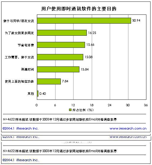即時通訊作為網(wǎng)民最常使用的應用之一,即時通訊的多功能性可以滿足用戶的不同需求,達到不同的目的,根據(jù)艾瑞市場咨詢(iResearch)的研究結(jié)果,在問及用戶使用即時通訊的目的時,有31%的用戶選擇了“便于與同學/朋友交流”作為使用即時通訊軟件的最主要的目的,16%的用戶選擇“為了交到更多的朋友”作為作主要的目的,兩者相加的比例接近了50%。說明與朋友、網(wǎng)友間的交流聊天仍然是即時通訊軟件的最主要的功能。同時,即時通訊軟件用戶一般還同時使用包括文件傳送、語音聊天、郵件檢查、群組聊天、手機綁定等其他功能。而文件傳輸是其中最主要的一項功能。