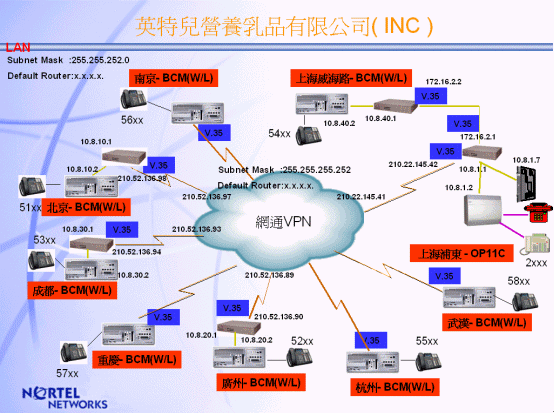 此系統的VPN線路由中國網通公司提供,INC上海浦東生產基地為主點(Nortel OP11C)系統通過ITG(Internet Telephone Gateway)卡和其他七個城市的分支機構的BCM相連接,系統結構圖如下: