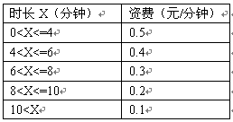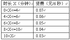 例3,國內長途話費在時長不超過4分鐘的情況下,按0.07元/6秒收;超過4分鐘但不超過6分鐘,統(tǒng)一按0.06元/6秒收;超過6分鐘但不超過8分鐘,統(tǒng)一按0.05元/6秒收。怀^8分鐘但不超過10分鐘,統(tǒng)一按0.04元/6秒收取;超過10分鐘,統(tǒng)一按0.03元/6秒收取。