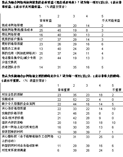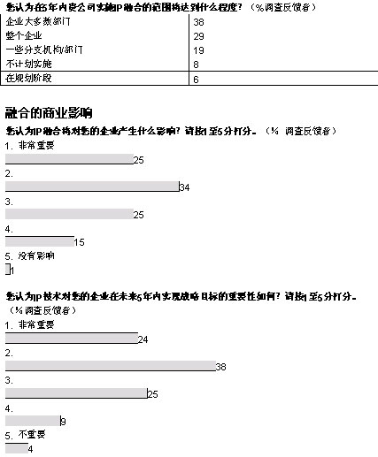 我們調查的企業(yè)中,有超過三分之二將在未來五年內實現(xiàn)大多數(shù)或者所有部門向融合網(wǎng)絡的轉型。大部分企業(yè)采取按部就班的形式在某些特殊部門和業(yè)務開始部署。在融合應用中,IP語音電話將在未來三年內吸引大量投資;管理人士期望通過大幅削減公司內部的通話費用獲得早期的回報。在更廣泛的層面上,大多數(shù)管理者預計,融合網(wǎng)絡對其企業(yè)的商業(yè)影響將會“非常重要”或者“重要”。