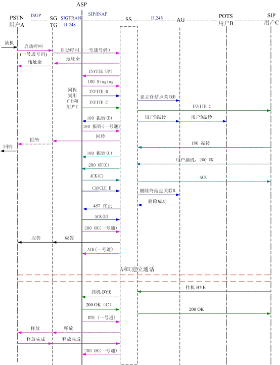 圖4為PSTN用戶A撥打一號通用戶,同振到軟交換域AG下POTS用戶B和SIP用戶C,其中軟交換和應(yīng)用服務(wù)器以SIP協(xié)議相連,軟交換和AG、軟交換和TG以H.248協(xié)議相連?梢钥吹剑脩鬊和用戶C同時(shí)振鈴,用戶C摘機(jī)應(yīng)答,應(yīng)用服務(wù)器取消了對用戶B的振鈴。雙方通話,通話結(jié)束,用戶C掛機(jī),系統(tǒng)釋放了連接。