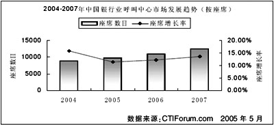 根據(jù)CTI論壇預測,到2007年,銀行業(yè)呼叫中心的座席總數(shù)將達到12500個,累計投資額將達到70億元。2005年到2007年的投資額復合年平均增長率為14.86%。未來,銀行業(yè)在未來三年內(nèi)的發(fā)展穩(wěn)定,并以較高速度增長。