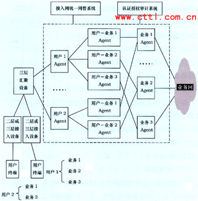 “用戶Agent”負(fù)責(zé)與用戶進(jìn)行通信(用戶與用戶Agent通過IPsec加密方式通信,而用戶Agent與其它Agent則進(jìn)行明碼通信),完成用戶的接入認(rèn)證(與AAA系統(tǒng))、用戶網(wǎng)絡(luò)標(biāo)識(shí)的分配、用戶業(yè)務(wù)菜單的推送、根據(jù)用戶從菜單中選擇的業(yè)務(wù)來生成“用戶-業(yè)務(wù)Agent”。還負(fù)責(zé)與“接入網(wǎng)統(tǒng)一網(wǎng)管系統(tǒng)”進(jìn)行交互完成用戶選定業(yè)務(wù)的接納控制和(或)資源預(yù)留。