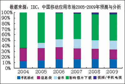 與此同時(shí),中國(guó)移動(dòng)增值電信業(yè)務(wù)占移動(dòng)運(yùn)營(yíng)商的業(yè)務(wù)收入比重不斷增加,根據(jù)IDC統(tǒng)計(jì),2004年中國(guó)移動(dòng)增值服務(wù)市場(chǎng)的個(gè)人應(yīng)用市場(chǎng)達(dá)到340億元人民幣,該市場(chǎng)在2009年將達(dá)到880億元人民幣,其2004年~2009年復(fù)合年平均增長(zhǎng)率為15.3%。
