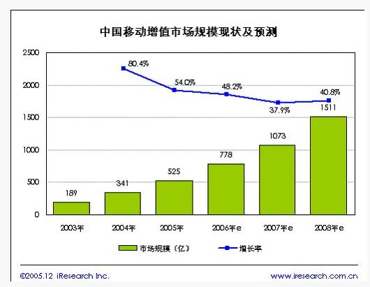 隨著中國移動電話用戶的不斷增長和移動增值服務(wù)的不斷發(fā)展創(chuàng)新,移動增值服務(wù)已經(jīng)成為現(xiàn)隨著市場的發(fā)展和不斷規(guī)范,中國移動增值服務(wù)市場將進入相對平穩(wěn)的發(fā)展階段。據(jù)iResearch預(yù)測,中國移動增值服務(wù)的市場規(guī)模增長速度將逐年減緩,到2008年受奧運會影響增長速度提高,規(guī)模將突破1500億元。