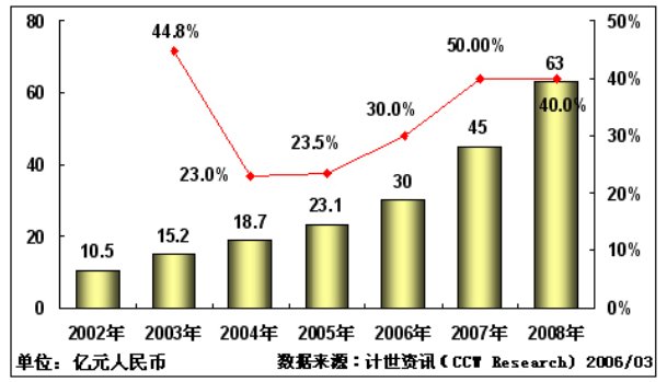 計(jì)世資訊(CCW Research)預(yù)測認(rèn)為,2006年和2007年視頻會議市場將以30%和50%的增長率飛速增長。市場規(guī)模分別達(dá)到30億和45億人民幣。而2008年隨著奧運(yùn)建設(shè)的告一段落,整個市場將進(jìn)入一個消化調(diào)整期,市場發(fā)展速度則逐步開始放慢。