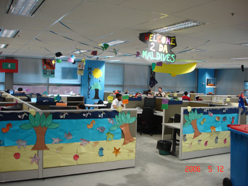 由于這種獨(dú)特的管理方式吸引了眾多的同行前來參觀,該中心特別安排了熱情的Sally負(fù)責(zé)導(dǎo)游。Sally帶我們參觀說的第一句話就是:“我真是喜愛我們的呼叫中心,這里的年輕人富有創(chuàng)意,充滿激情,他們非常喜歡在這里工作。”于是我們參觀了“蜘蛛俠”,“蒙娜麗莎”,“大英帝國”,“典雅餐廳”,“熱帶公園”,“幾何世界”,“海底世界”,“白色圣誕節(jié)”等不同的Pod,實(shí)在是好像到了聯(lián)合國。
