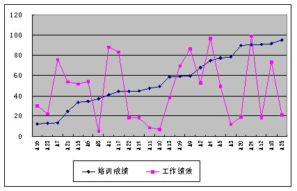 我們通過(guò)分析,圖3顯示,員工的培訓(xùn)成績(jī)和其工作績(jī)效是無(wú)關(guān)的,這說(shuō)明培訓(xùn)是無(wú)效的。無(wú)效的原因也許是由于培訓(xùn)內(nèi)容不合理或培訓(xùn)組織實(shí)施不善等原因,總之培訓(xùn)是無(wú)效的,需要改進(jìn)。
